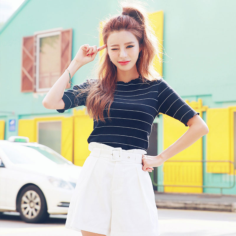 韓都衣捨2017韓版女裝夏裝新款時尚修身顯瘦圓領條紋T恤OGY7711娋 顯瘦版型 舒適面料 條紋元素