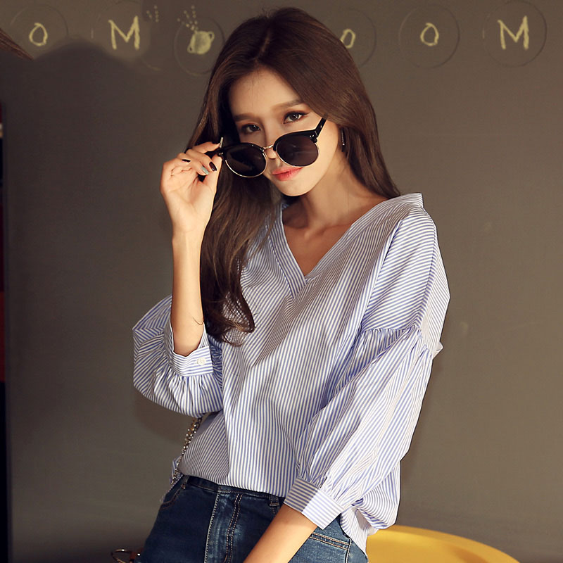 韓都衣捨2017韓版女裝春裝新款條紋顯瘦百搭寬鬆v領七分袖襯衫潮 領券立減/單件包郵/七天無理由退換