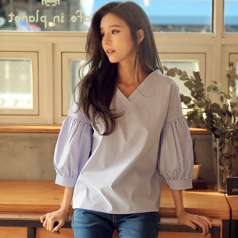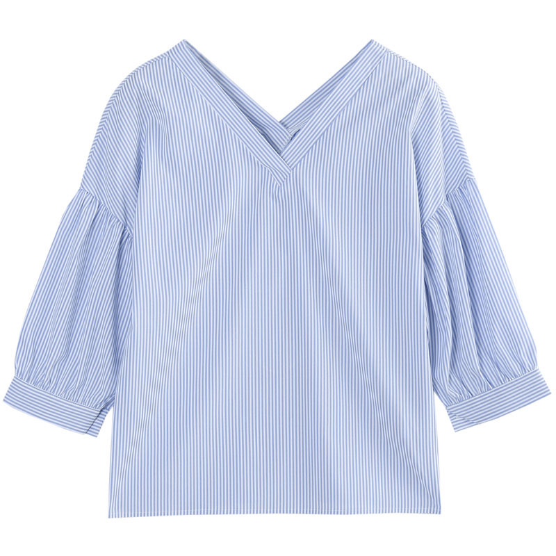 商品名稱:韓都衣捨2017韓版女裝春裝新款條紋顯瘦百搭寬鬆v領七分袖襯衫潮 領券立減/單件包郵/七天無理由退換