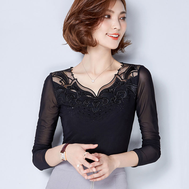 商品名稱:韓美格2017春秋新款修身大碼蕾絲網紗打底衫女長袖薄款圓領女T恤 全店商品 二件減5元 三件減10